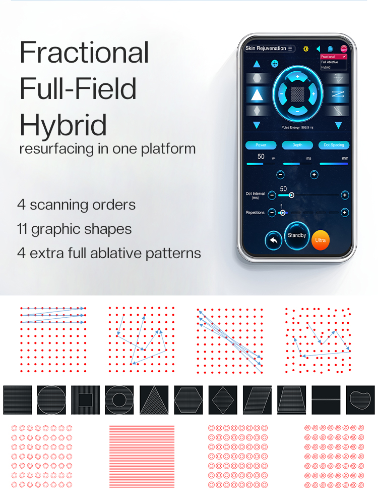 Hybrid Mode: A versatile setting that combines both fractional and ablative actions, perfect for treating mixed scar types or sensitive areas with enhanced safety.