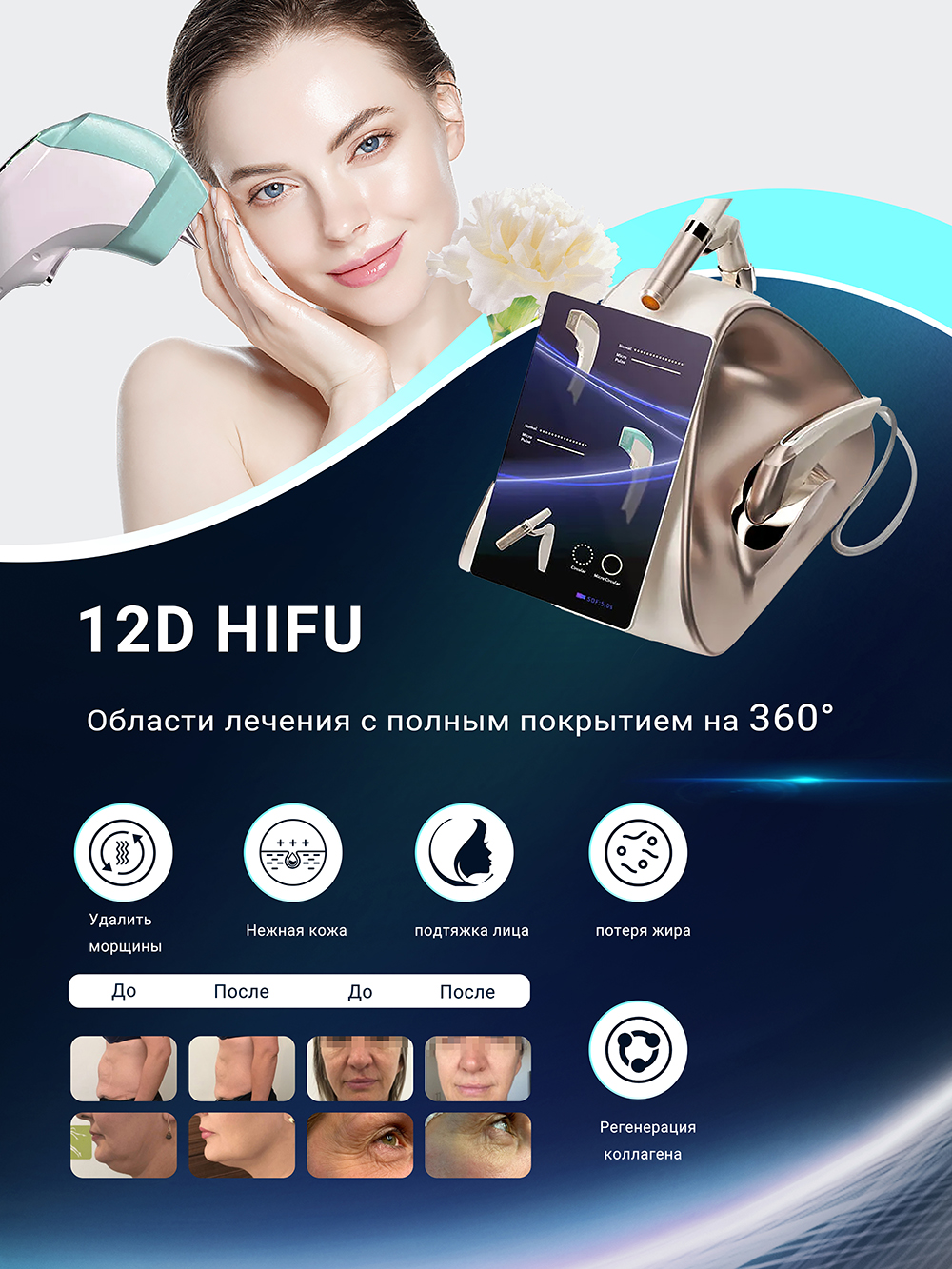 12D HIFU (High-Intensity Focused Ultrasound) technology is a non-invasive skin lifting and tightening treatment that uses ultrasound energy to target the deep layers of the skin without causing damage to the surface. The 12D HIFU machine delivers focused ultrasound energy to specific depths in the skin, stimulating the production of collagen and elastin which helps to improve skin firmness and elasticity.