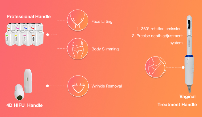 5D HIFU Machine: 3D face handle + 4D eye handle + 360° vaginal handle with a total of 13 depths